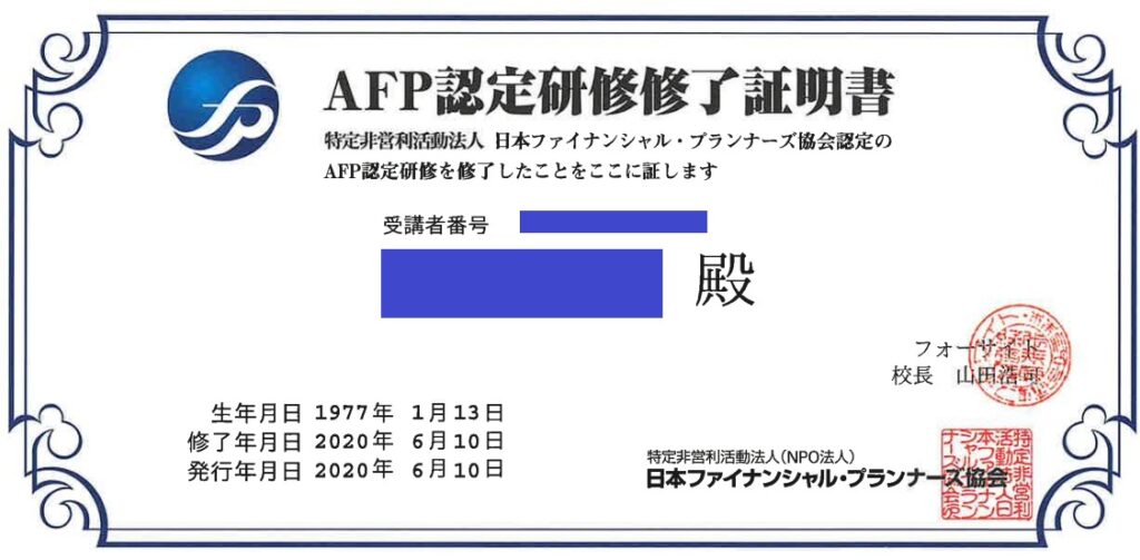 提案書を提出した後、認定完了の連絡をいただき、郵送で「AFP認定研修 修了証明書」が届きました。