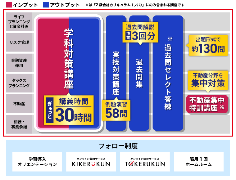 | FP2級 ライト | 49,280円 | ・学科対策講座 ・実技対策講座 ・過去問集 ・映像講義 約33時間 ・製本テキスト ・デジタルブック ・導入オリエンテーション ・ホームルーム ・オンライン演習TOKERUKUN ・質問10回 |