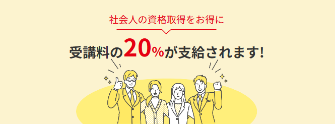 - 条件を満たせば、一般教育訓練給付制度で受講料の20%が支給されます。