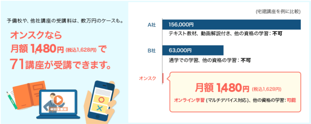 オンスク.JPのサブスクは1契約で複数資格講座が受け放題です。
