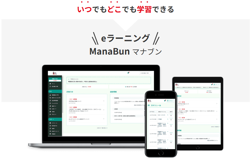 フルカラーテキストで理解を整理し、講義で迷いをなくし、eラーニングManaBunで演習・進捗管理まで一気に回せる設計になっています。