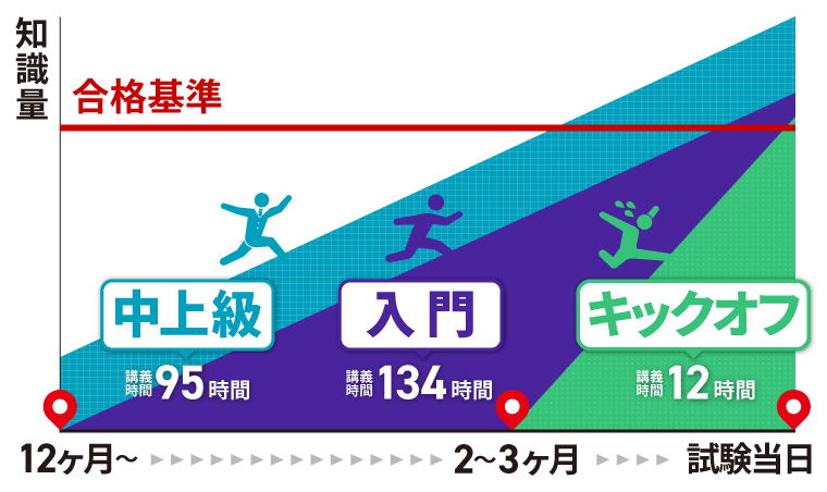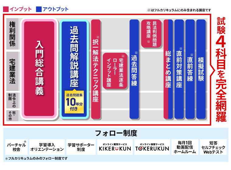 その点、入門カリキュラム(フル)なら、学習〜直前対策までの流れが最初から見えているため、途中で迷わず、学習そのものに集中しやすくなります。