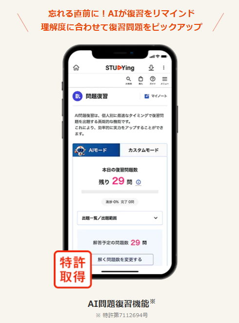 - AI学習サポート:復習タイミングや実力把握を機能で補える
